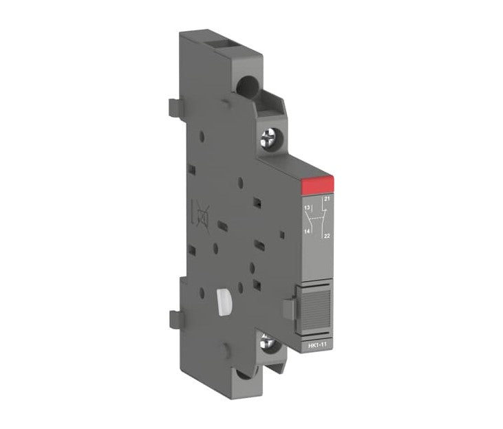 Auxiliary contacts HK1 change position with the main contacts of the manual motor starter. They are mounted laterally on the right side of manual motor starters MS116, MS132 or MS165. HK1-11A provides 1 NO + 1 NC contacts as well as a special terminal marking compared to HK1-11: terminals are marked with 13/14 and 21/22.